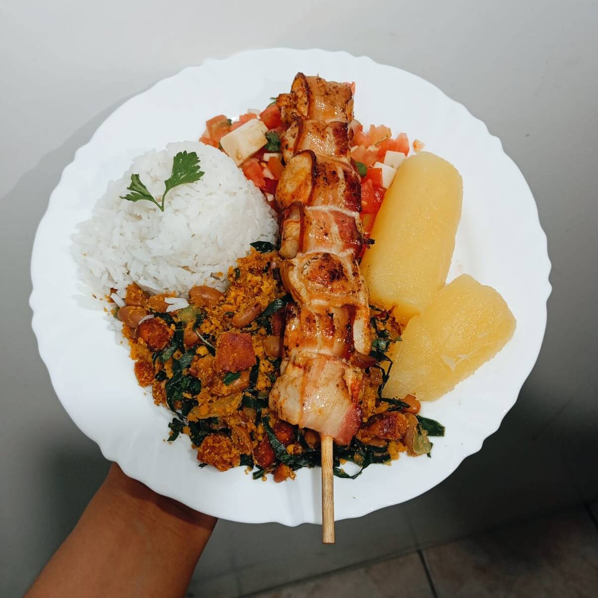 Jantinha tamanho padrão completinha no capricho, acompanha arroz cristal, feijão tropeiro bem temperado, mandioca e vinagrete.