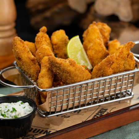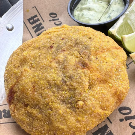 300g de Tilápia Empanada na Farinha de Fubá, Frita Até Ficar Crocante e Leve. Acompanha Molho Verde Refrescante. Delícia Que Derrete na Boca!