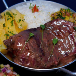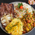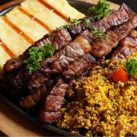Picanha Serenada no Ponto Certo, Servida com Arroz Soltinho, Feijão Tropeiro e Mandioca Cozida. Almoço Saboroso, Raiz e Cheio de Personalidade!