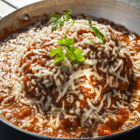 Disco Bovino Recheado com Queijo, Coberto com Molho de Tomate Defumado e Finalizado com Mais Queijo Derretido. Uma Bomba de Sabor Que Derrete no Prato e no Coração!