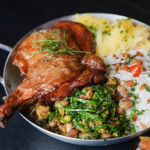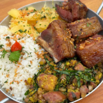 Coxa e Sobrecoxa Defumadas no Capricho, Servidas com Arroz, Feijão Tropeiro e Mandioca Cozida. Almoço Raiz Pra Quem Gosta de Frango com Sabor de Verdade!