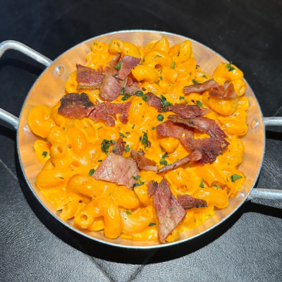 Macarrão Caracolino Envolvido em Molho Cremoso de Queijo Tipo Cheddar, Finalizado com Bacon Crocante. Um Clássico Americano Que Chegou Pra Embuchar com Estilo e Muito Sabor!