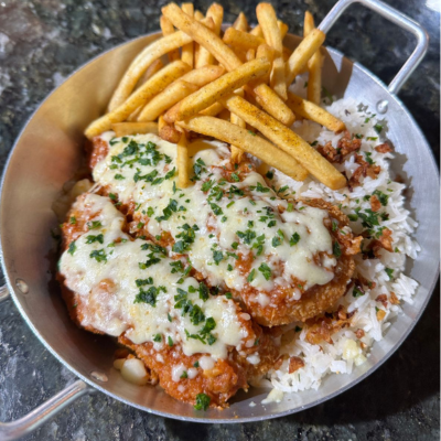 Filé de Frango Empanado e Coberto com Molho de Tomate e Queijo Derretido, Acompanhado de Arroz Branco e Fritas Douradinhas. Clássico Que Nunca Falha e Sempre Satisfaz!