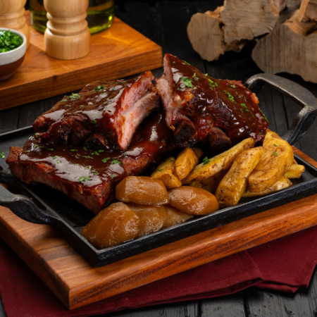 Costelinha Suína Defumada Por 4 Horas e Finalizada no Ponto Certo, Regada com Molho Barbecue. Acompanha Maçã Caramelizada e Batata Rústica Frita. Sabor Que Vicia de Tão Bom!