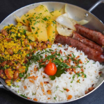Linguiça de Costela Vpj Bem Dourada, com Feijão Tropeiro, Arroz com Alho e Mandioca. Almoço Bruto, Saboroso e do Jeito Que o Gordinho Raiz Gosta!