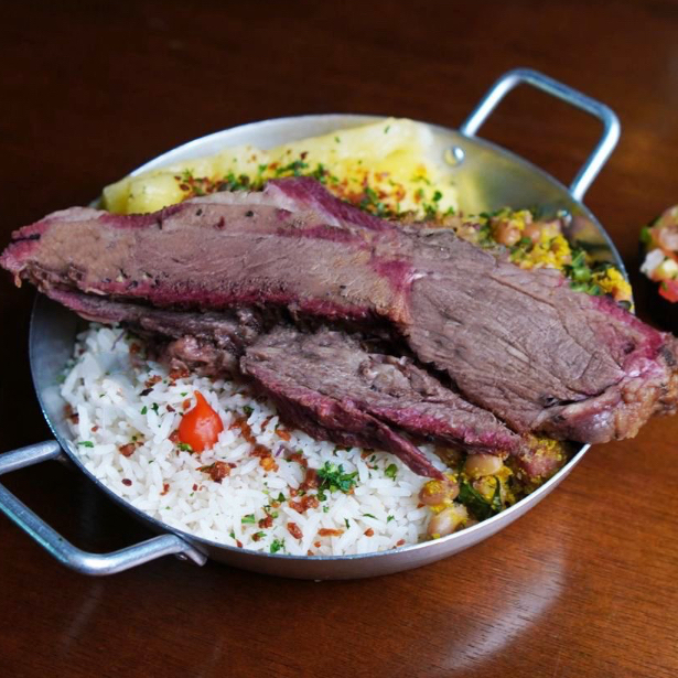 200g de Peito Bovino Angus Defumado por 6 Horas na Lenha Frutífera, Servido com Arroz, Feijão Tropeiro e Mandioca. Almoço Nobre, Fumacento e Suculento!