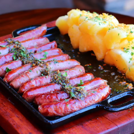 10 Unidades de Linguiça de Costela Bovina Servidas no Ponto Perfeito, com Mandioca Cozida e Chimichurri da Casa. Sabor Intenso Pra Quem Gosta de Carne com Personalidade!
