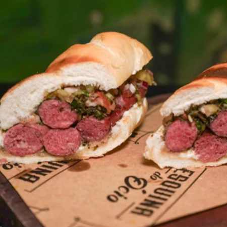 200g de Linguiça de Costela no Ponto, com Vinagrete, Chimichurri e Maionese de Limão, Tudo no Pão Francês do Dia. Sanduba Raiz, Cheio de Sabor e com Mordida Que Fala Alto!
