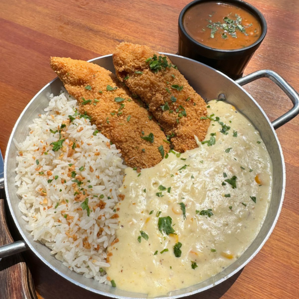Frango Empanado e Frito no Ponto, Servido com Arroz Branco, Feijão de Caldo e Creme de Milho Cremoso. Crocância Por Fora, Maciez Por Dentro e Um Molho Que É Puro Amor em Forma de Sabor!
