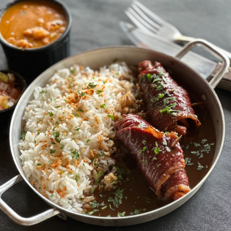 Bife Recheado no Creme de Cebola, Bem Temperado e Cozido no Ponto. Acompanha Arroz Branco e Feijão de Caldo. Almoço Raiz Que Lembra Comida de Casa e Enche o Prato com Sabor!