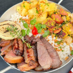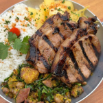 Lombo Suíno Grelhado com Arroz, Mandioca e Feijão Tropeiro ou de Caldo. Um Almoço Completo, Saboroso e Bem Servido Pra Encher a Barriga com Alegria!