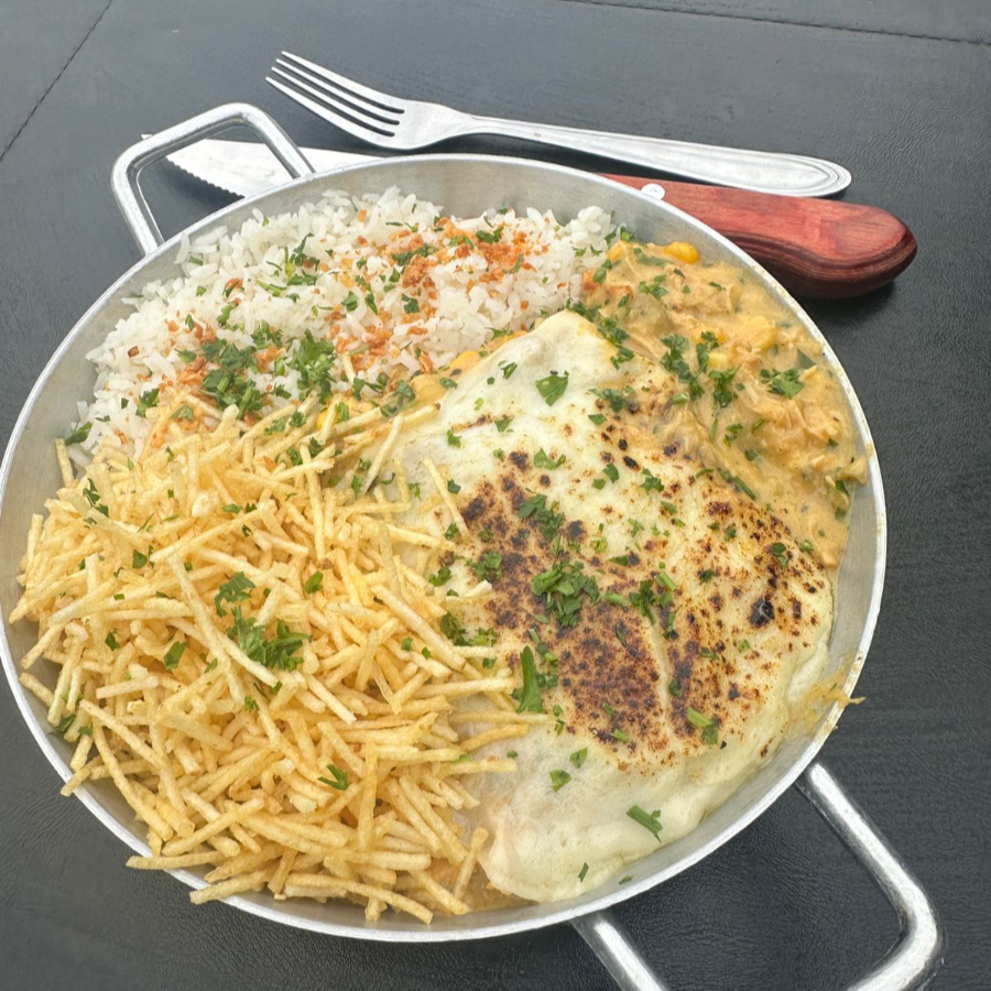 Frango Defumado Cremoso com Milho e Requeijão, Gratinado e Servido com Arroz Branco e Batata Palha Crocante. Prato Que Aquece a Alma e Faz o Coração Bater Mais Forte!