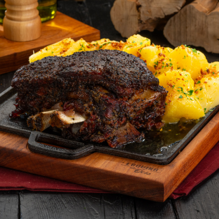 Costela Bovina Defumada Por 5 Horas na Lenha Frutífera, Finalizada Lentamente Até Ficar Macia e Suculenta. Acompanha Mandioca Cozida. Uma Explosão de Sabor Que Derrete na Boca!