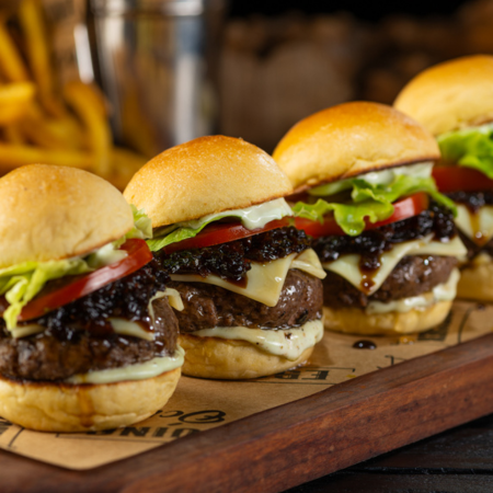 4 Mini Hambúrgueres com 80g Cada, Molho Verde da Casa, Queijo, Cebola Caramelizada, Alface e Tomate. Pequenos no Tamanho, Enormes no Sabor!