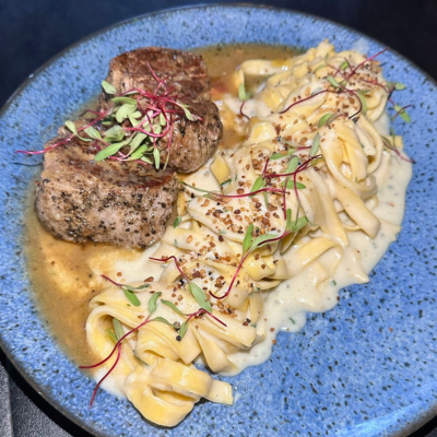 Massa Talharim ao Molho Branco Cremoso, Servida com 200g de Filé Mignon ao Molho Bechamel. Um Prato Fino, Carregado de Sabor e Que Derrete na Boca Sem Pedido de Desculpas!
