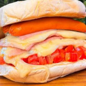 Pão, presunto, mussarela, tomate, ovo, salsicha e catupiry acompanha um refrigerante do Estoque