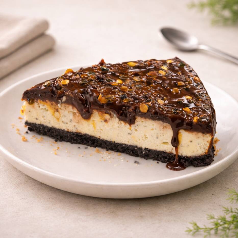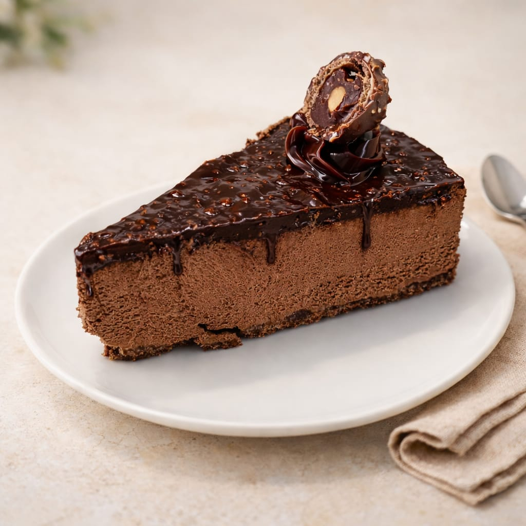 Uma sobremesa irresistível feita com base crocante de cacau, recheio cremoso de cheesecake com chocolate nobre e avelã, finalizada com ganache de chocolate meio amargo e decorada com flor de brigadeiro e Ferrero Rocher. Um sabor intenso, elegante e marcante — perfeita para quem ama uma experiência doce inesquecível.