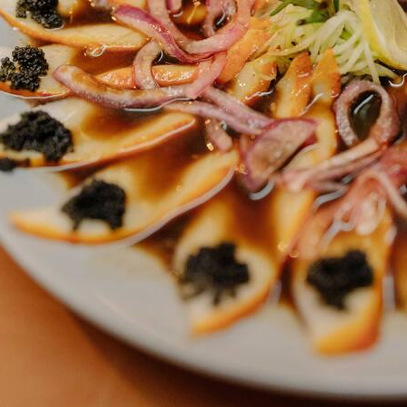 Carpaccio de peixe prego defumado com picles de cebola roxa defumada + ovas de massago, uma harmonização perfeita com um bom vinho carbanet sauvignon, Quantidade de 20 Lâminas