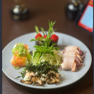 (Cubos de salmão e saint peter, gengibre ralado, limão, shoyu, pimenta shirasha, cebolinha). 240 gr