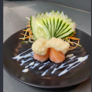 Delicioso gunkan de salmão selado, cream cheese e shimeji, decorado com crispi de couve e teriaki. 04 unidades