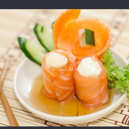 (Filé de salmão enrolado no cream cheese c/ cobertura de calda de Maracujá) - 02 unidades