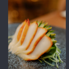 SASHIMI DE PEIXE PREGO DEFUMADO, UM SABOR MARCANTE, PERFEITO PARA HARMONIZAR COM UM BOM VINHO MERLOT. QNT: 5 LAMINAS