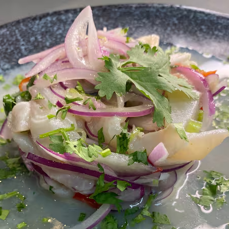 Ceviche premium de Saint Peter com cebola roxa envolto em laminas da Saint Peter maçaricada com gergelim salteado, calda de sweet chili e cebolinha. 6 unidades.