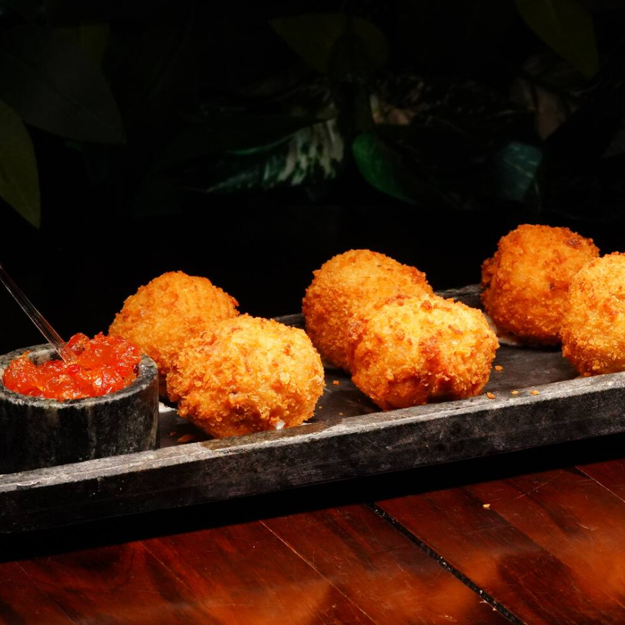 Croquete Frango com Cheddar e Bacon servido com geléia de pimenta