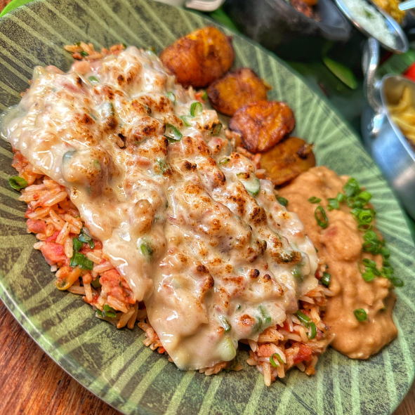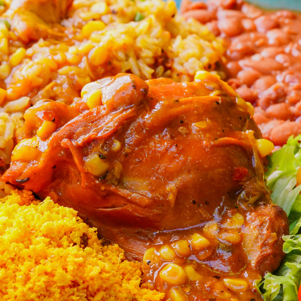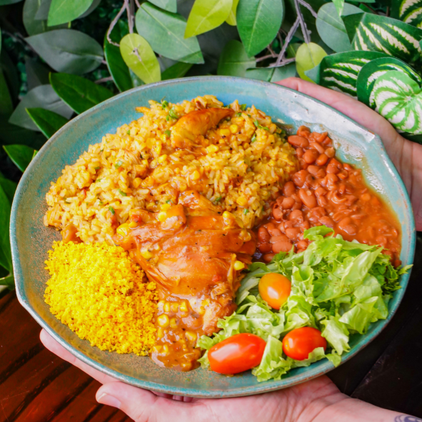 Frango ao molho com pequi, arroz, feijão, mix de folhas e farofa