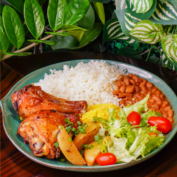 01 Coxa e 01 Sobrecoxa assada na cerveja com batata 200 ml de feijão de caldo 200 ml de salada (mix de folhas com tomate cereja) 01 coca cola