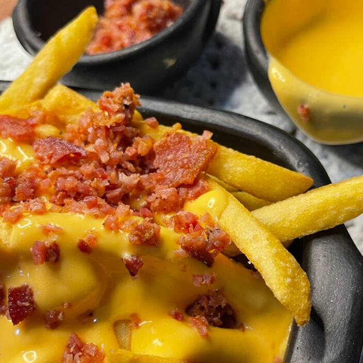 Batata frita com o nosso cremoso creme de cheddar e farofinha de bacon