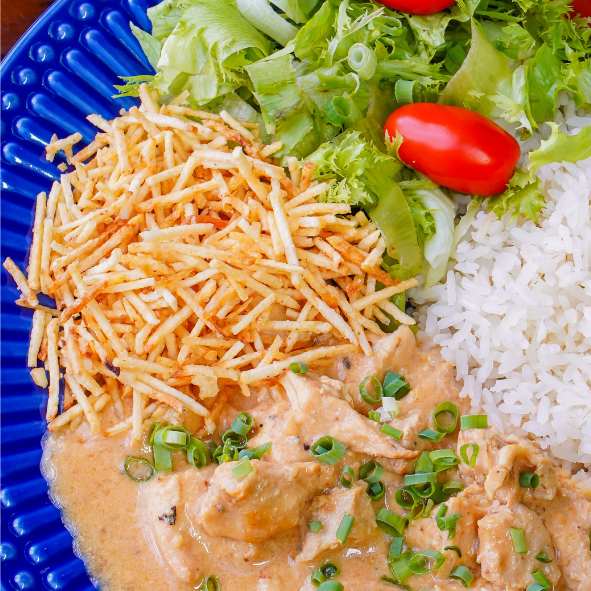 Saboroso strogonoff de frango, arroz, batata palha e mix de alface com tomate cereja