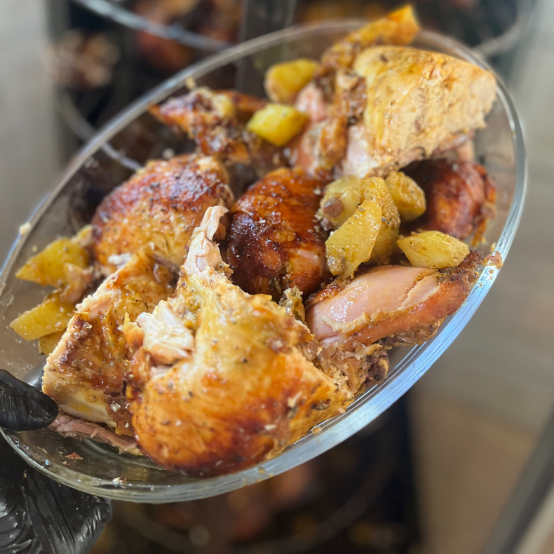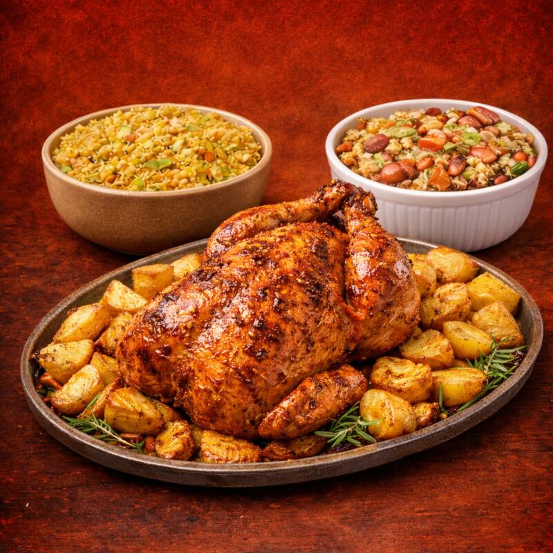 Delicioso frango assado suculento por dentro e crocante por fora. Acompanhado de farofa caseira crocante e batatas assadas.