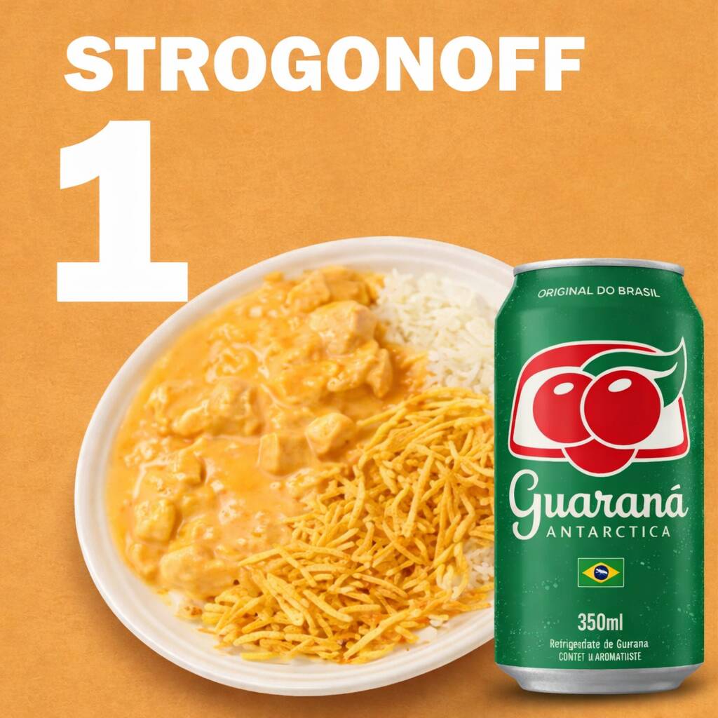 Acompanha: Arroz soltinho, batata palha e strogonof cremoso com ketchup + Guaraná 350ML