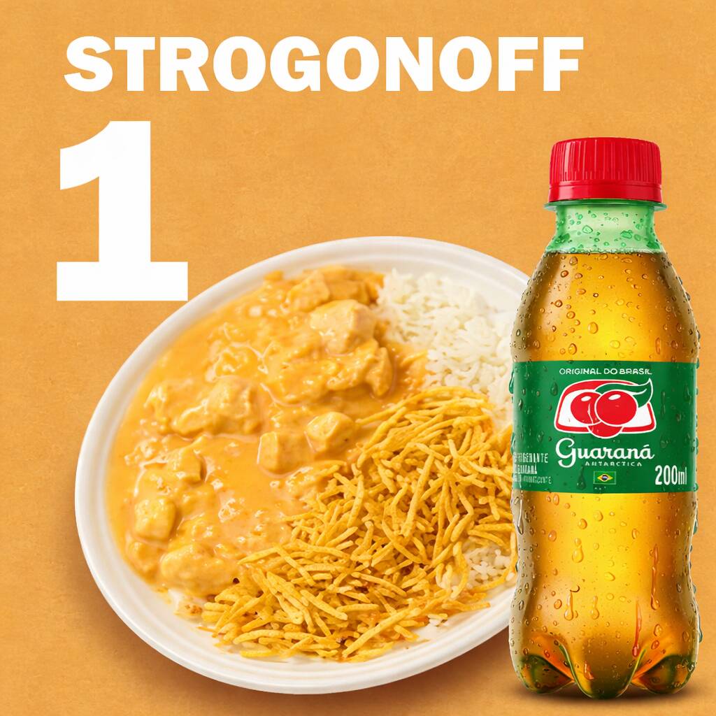 Acompanha: Arroz soltinho, batata palha e strogonof cremoso com ketchup + Guaraná 200ML