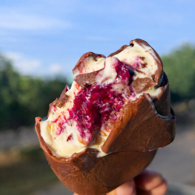 Casquinha de chocolate blend nobre Base cremosa E um coração intenso de framboesa A combinação perfeita entre cremosidade, crocância e a leve acidez da fruta.