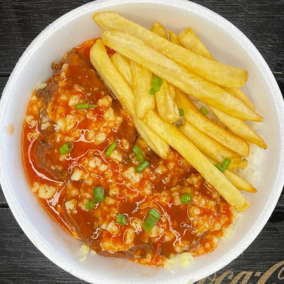 (Parmegiana C/ Fritas) Marmita com delicioso filé de frango parmegiana (empanado na massa crocante coberto com molho de tomates e queijo) acompanhado de arroz branco e batatas fritas. Marmita indicada para 01 pessoa.