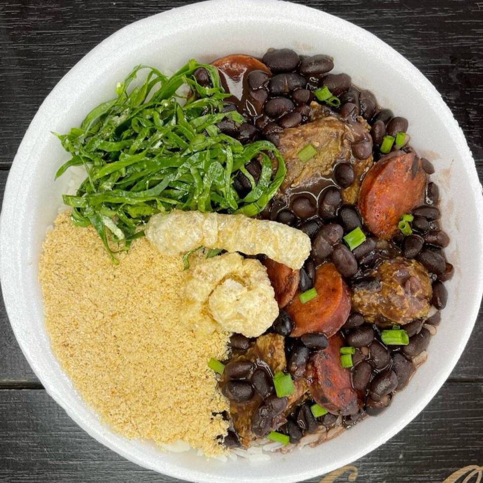 (Feijoada) Marmita feijoada magra individual (arroz, carne seca, lombo, costelinha, linguiça calabresa, paio, couve refogado na manteiga, farofa e torresmo). Marmita indicada para 01 pessoa.