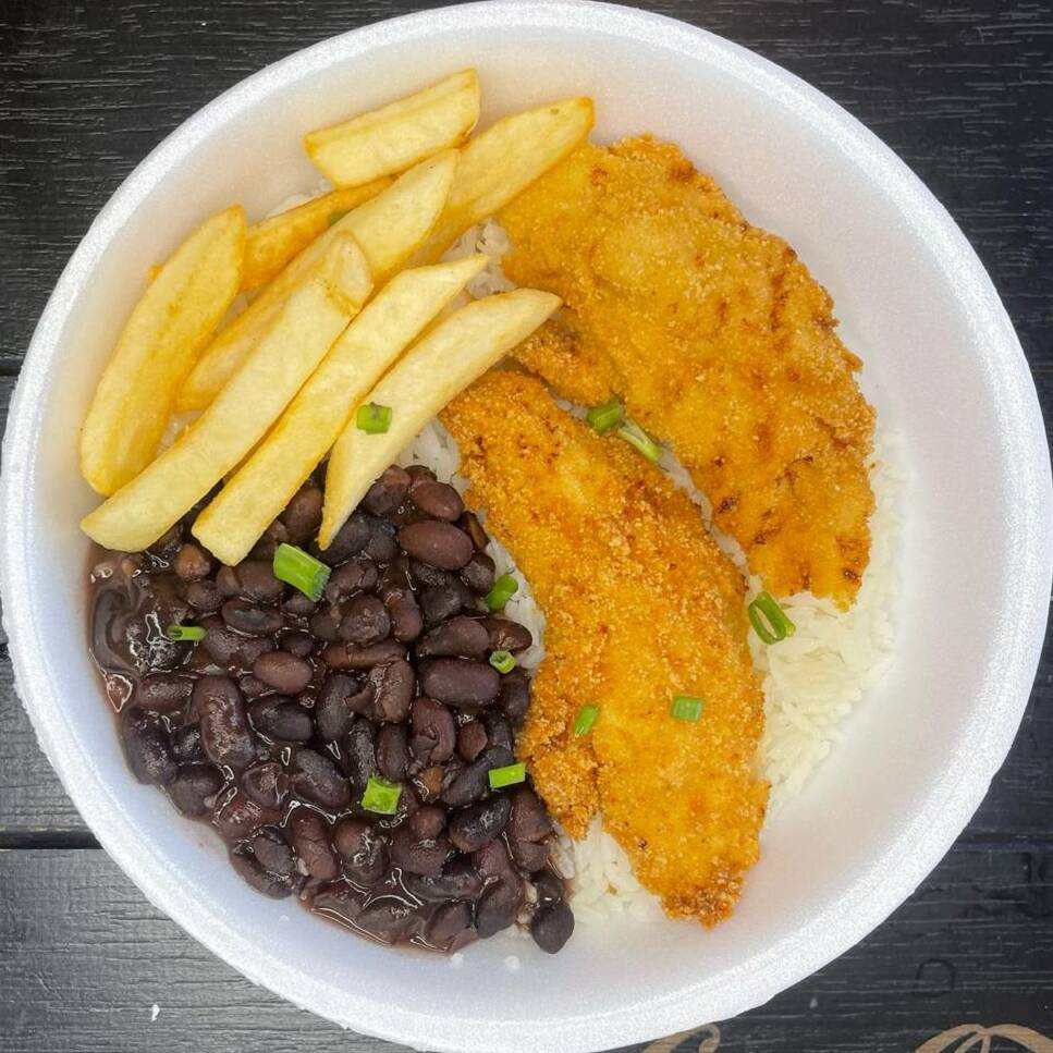 (Frango Empanado C/ Fritas) Marmita com delicioso filé de frango empanado na massa crocante acompanhado de arroz branco, feijão e batatas fritas. Marmita indicada para 01 pessoa.