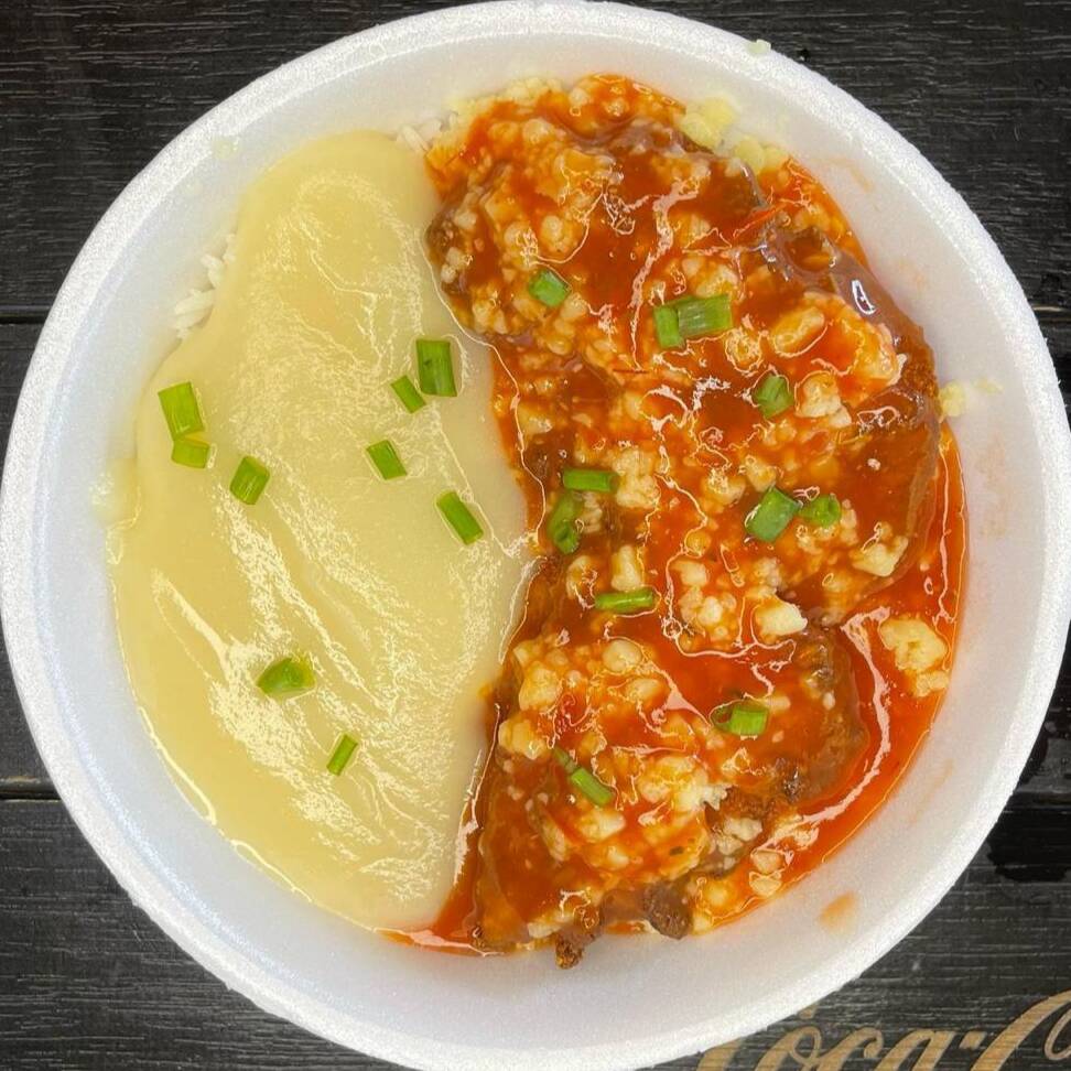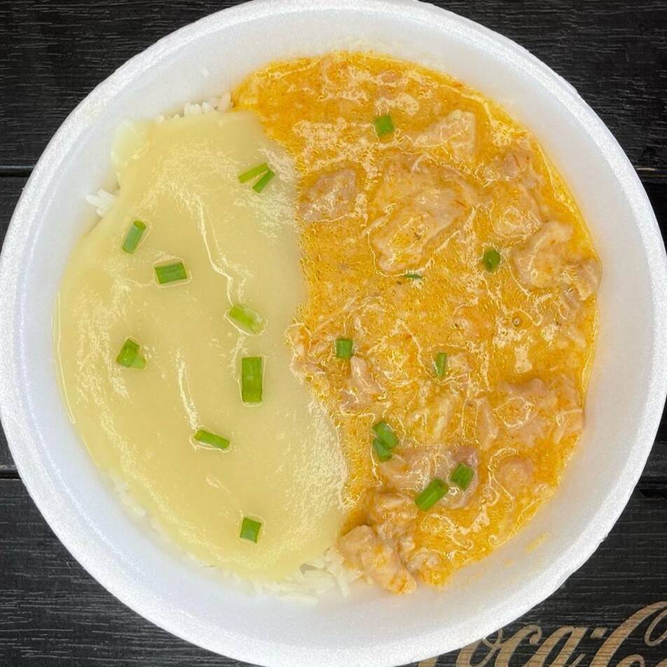 Strogonoff C/ Purê) Marmita com delicioso filé de frango ao molho estrogonofe acompanhado de arroz branco e purê de batatas inglesas. Marmita indicada para 01 pessoa.