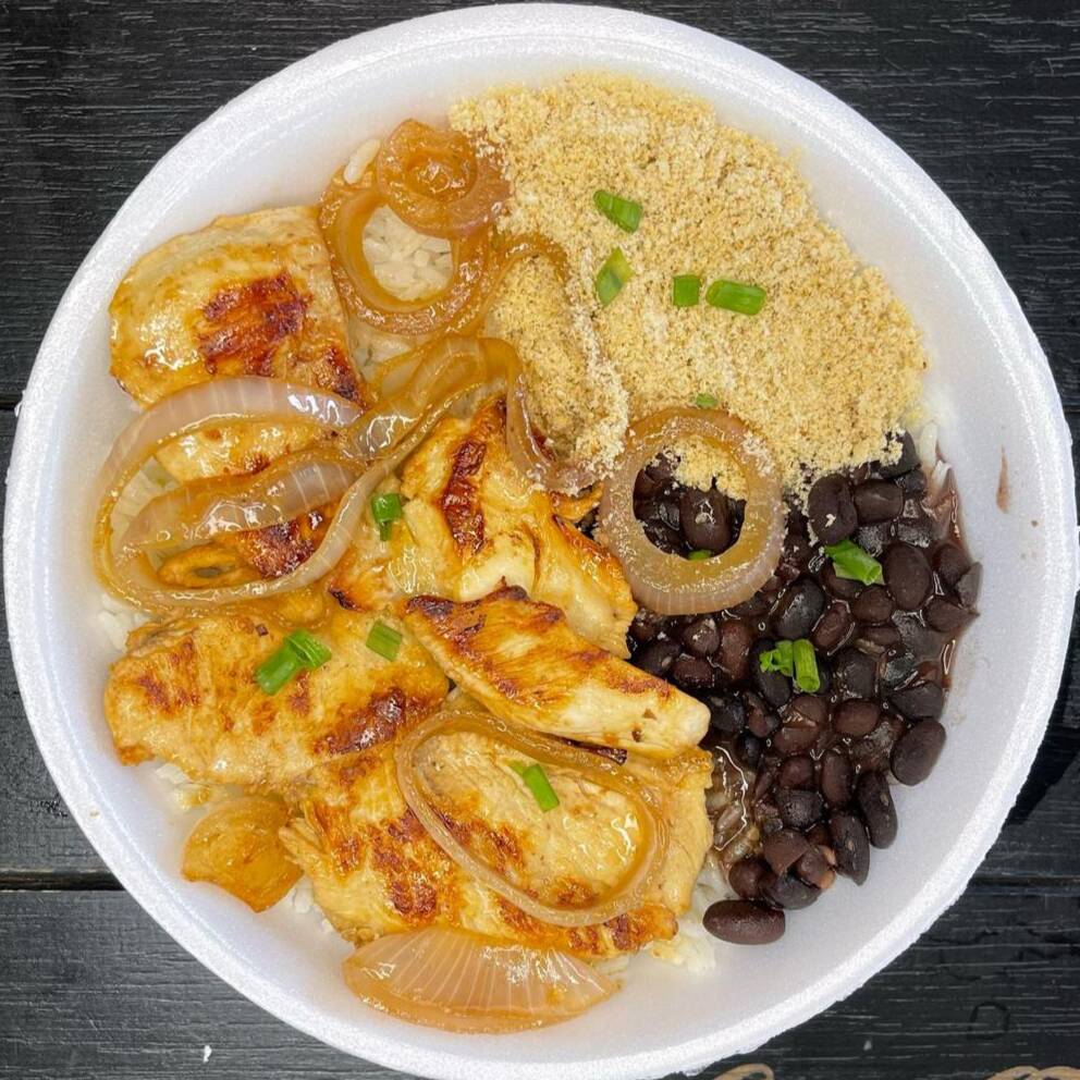 Marmita com delicioso bife de filé de frango acompanhado de arroz branco, farofa caseira e feijão preto. Marmita indicada para 01 pessoa.