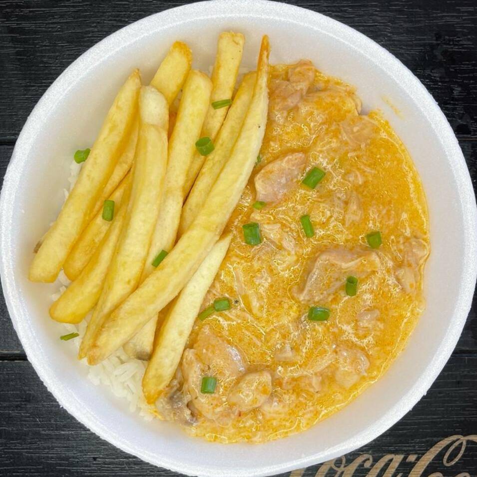 (Strogonoff C/ Fritas) Marmita com delicioso filé de frango ao molho estrogonofe acompanhado de arroz branco e batatas fritas. Marmita indicada para 01 pessoa.