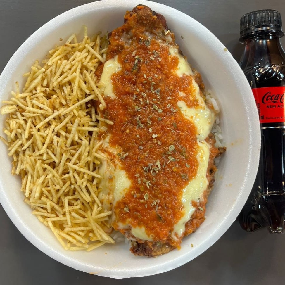 Marmita com delicioso filé de frango parmegiana (empanado na massa crocante coberto com molho de tomates e queijo) acompanhado de arroz branco e batatas Palha. Acompanha refrigerante pet Coca Cola Zero sem açúcar bem gelado. Marmita indicada para 01 pessoa.