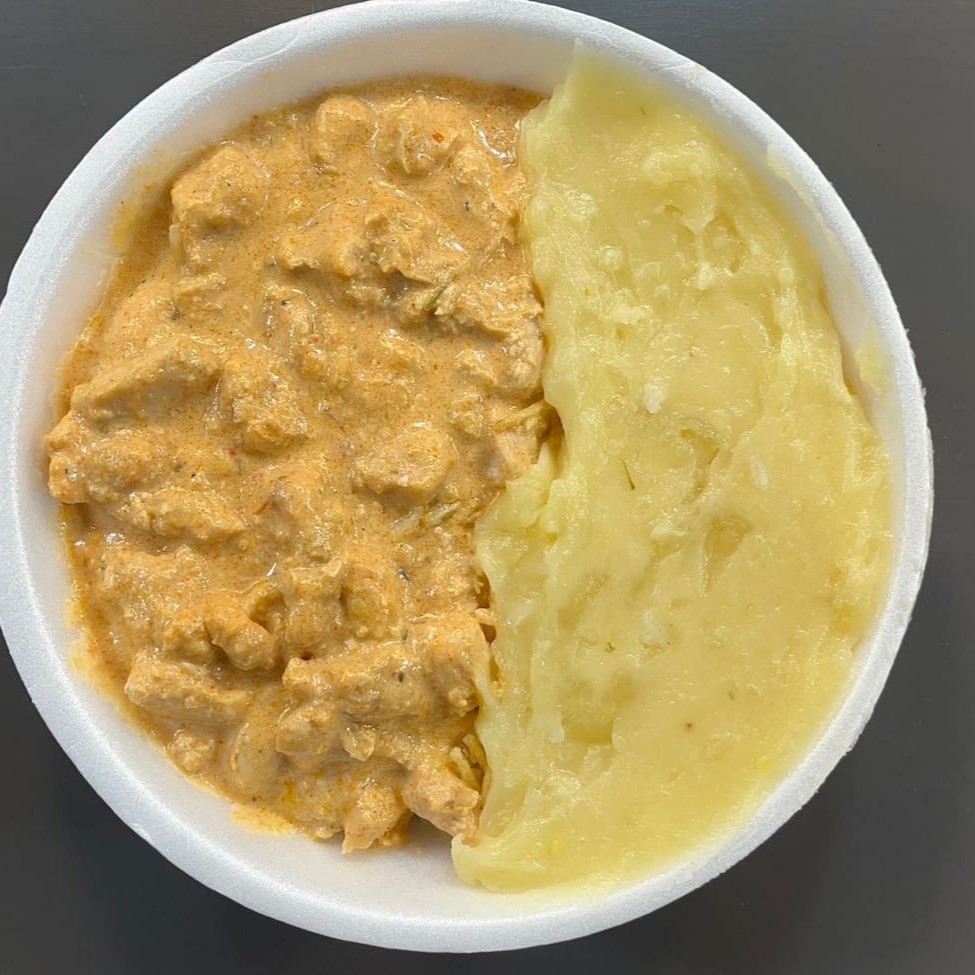 Marmita com delicioso filé de frango ao molho estrogonofe acompanhado de arroz branco e purê de batatas inglesas. Marmita indicada para 01 pessoa.