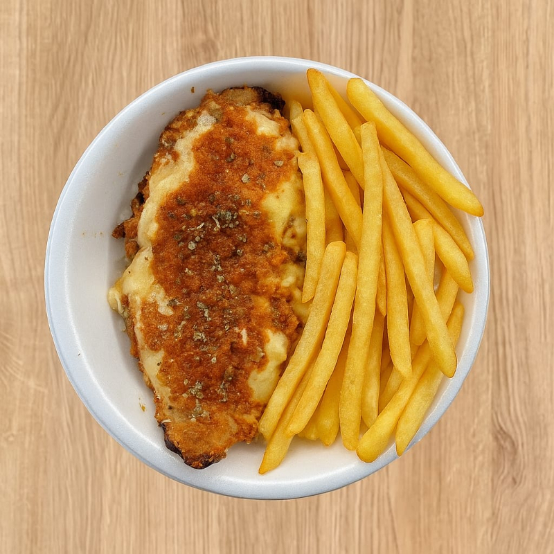 Marmita com delicioso filé de frango parmegiana (empanado na massa crocante coberto com molho de tomates e queijo) acompanhado de arroz branco e batatas Palha.. Marmita indicada para 01 pessoa.