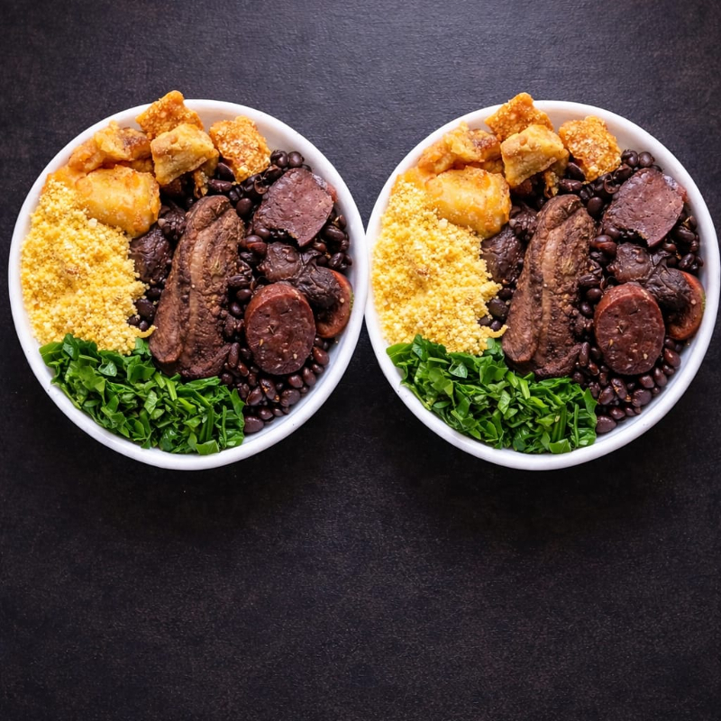 2 x Marmita feijoada magra individual (arroz, carne seca, lombo, costelinha, linguiça calabresa, paio, couve refogado na manteiga, farofa e torresmo). Marmita indicada para 01 pessoa.