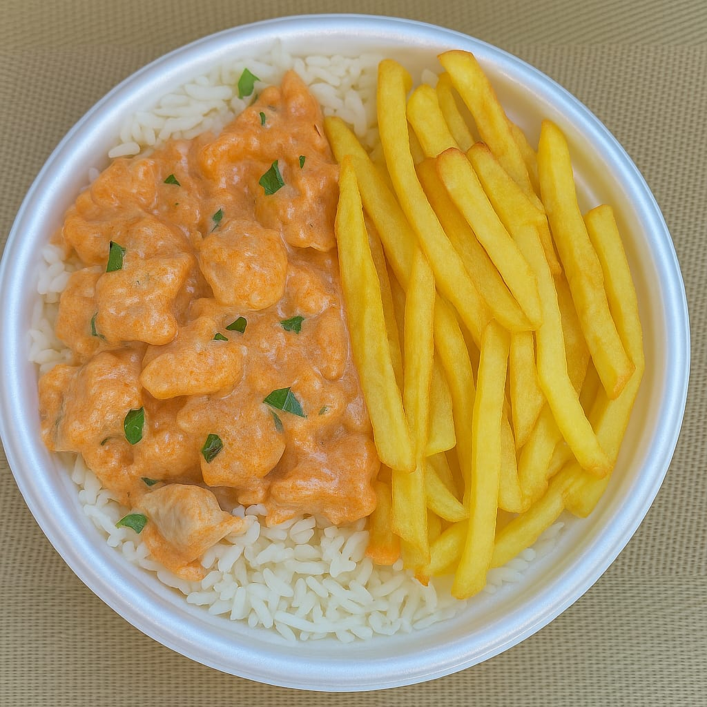 Marmita com delicioso filé de frango ao molho estrogonofe acompanhado de arroz branco e batatas fritas Marmita indicada para 01 pessoa.