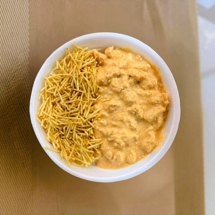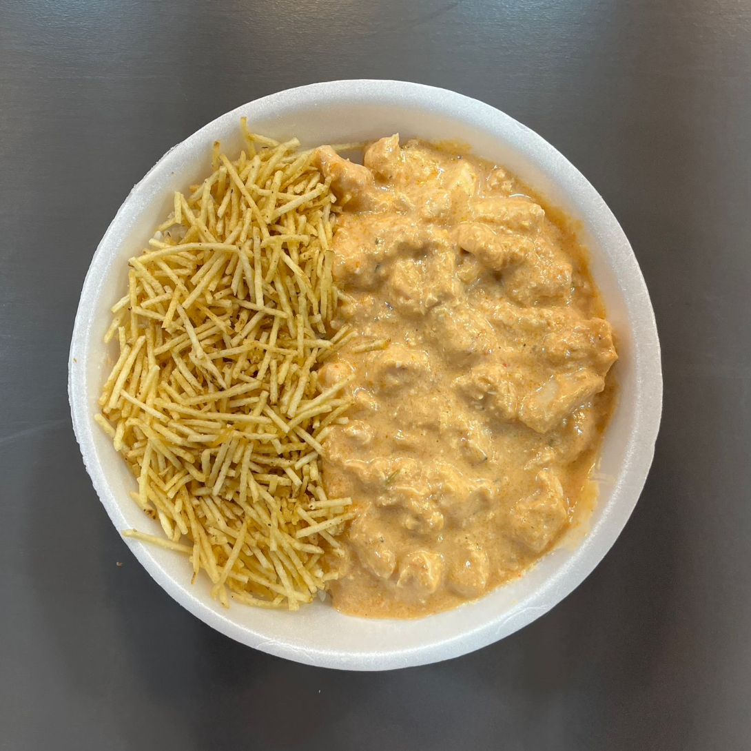 Marmita com delicioso filé de frango ao molho estrogonofe acompanhado de arroz branco e batatas Palha Marmita indicada para 01 pessoa.