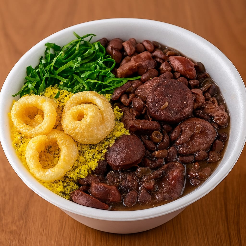 Marmita feijoada magra individual (arroz, carne seca, lombo, costelinha, linguiça calabresa, paio, couve refogado na manteiga, farofa e torresmo). Marmita indicada para 01 pessoa.