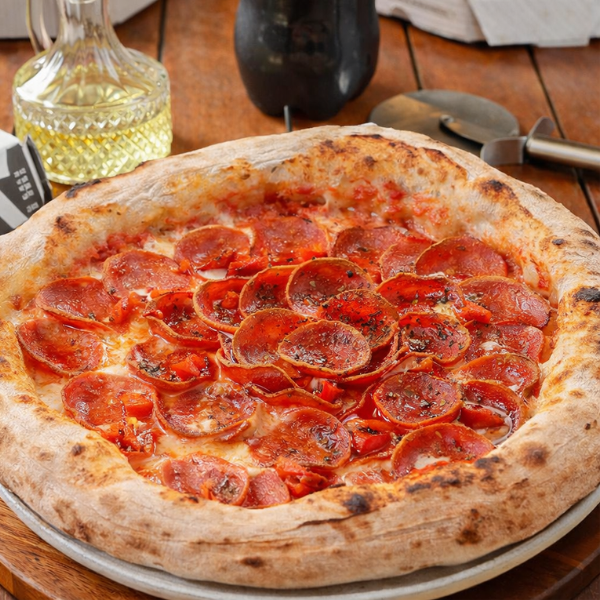 Salame Tipo Peperone Farto Sobre Muçarela Derretida, Molho de Tomate Equilibrado, Com Massa Maturada Crocante. Marcante e Irresistível